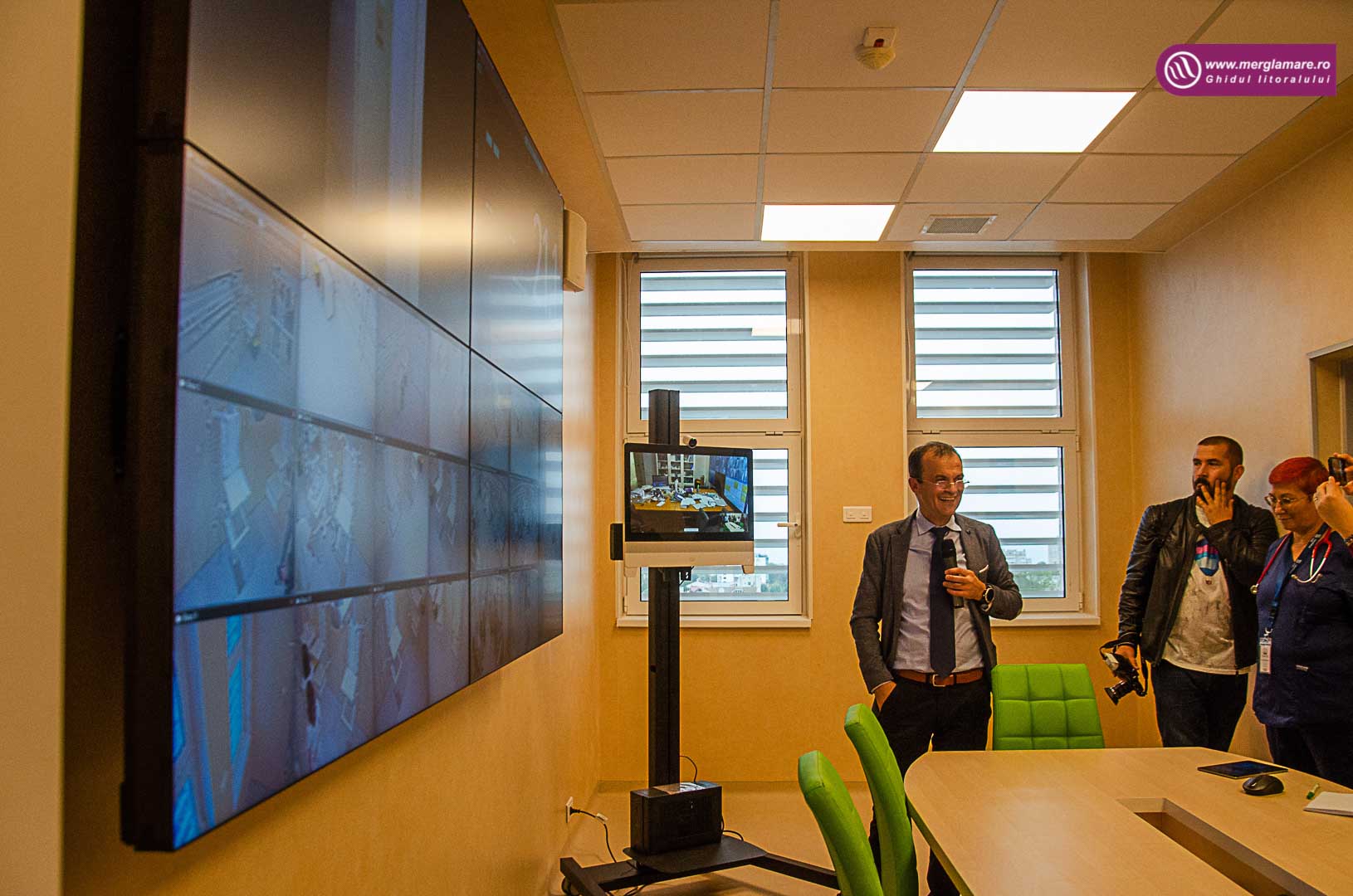 - Videowall în camera de gardă cu multiple funcții inclusiv telemedicină și organizarea de videoconferințe.